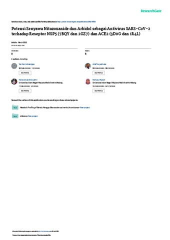 Nitazoxanide merupakan obat pro-drug untuk tizoxanide. Obat tersebut diketahui memiliki aktivitasantivirus pada MERS-CoV. Arbidol memiliki aktivitas antivirus pada H3N2 HA yang memiliki kesamaanstruktur dengan SARS-CoV-2. Reseptor target spesifik untuk obat-obat Anti SARS-CoV-2 saat ini adalah NSP5(nonstructural protein) dan ACE2 (angiotensin-converting enzyme 2). NSP5 memediasi replikasi dan transkripsiprotein-protein virus, sedangkan ACE2 sebagai fasilitator transport asam amino dan reseptor tempatterikatnya SARS-CoV maupun SARS-CoV-2. Tujuan penelitian ini adalah untuk mengetahui aktivitasantivirus SARS-CoV-2 dari senyawa Nitazoxanide dan Arbidol secara in silico. Senyawa nitazoxanide dan arbidoldipreparasi terlebih dahulu dengan melakukan pengunduhan kode PDB ID, penyiapan struktur 2D dan 3D,penentuan minimal energy, pembuatan kode SMILES, serta prediksi sifat fisikokimia dan toksisitas. Setelahdipreparasi, proses dilanjutkan dengan penambatan molekul menggunakan aplikasi PyRx-Vina®. Hasildocking dianalisis dengan perangkat lunak PyMOL® dan Discovery Studio Visualizer®. Hasil profil fisikokimiamenunjukkan bahwa senyawa arbidol dan nitazoxanide telah memenuhi hukum lima Lipinski dan masing-masing senyawa memiliki nilai LD50 sebesar 1350 mg/kg dan 340 mg/kg. Hasil penambatan senyawa ujidengan reseptor menghasilkan interaksi, yaitu ikatan hidrogen, interaksi hidrofobik, dan interaksielektrostatik. Interaksi nitazoxanide pada reseptor 2GZ7 serta arbidol pada reseptor 3D0G dan 1R4Lmenunjukkan perbedaan yang signifikan masing-masing terhadap lopinavir dan chloroquine dengan nilai p <0.05 sehingga senyawa tersebut diprediksi memiliki potensi antivirus yang lebih baik.