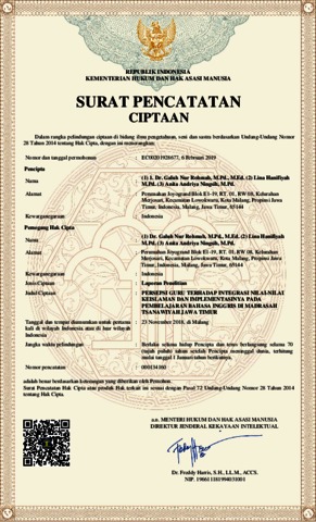 Galuh Nur Rohmah, Lina Hanifiyah, Ulil Fitriyah (2019) Persepsi guru terhadap integrasi nilai-nilai keislaman dan implementasinya pada pembelajaran bahasa Inggris di Madrasah Tsanawiyah Jawa Timur. EC00201928677.