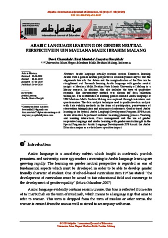 Chamidah, Dewi, Mustofa, Bisri and Rosyidah, Inayatur (2020) Learning Arabic language with gender neutral insight at Maulana Malik Ibrahim State Islamic University of Malang. Abjadia: International Journal of Education, 5 (1). pp. 37-48. ISSN 2443-0587