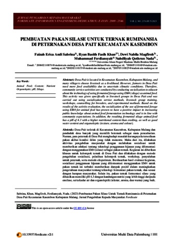 Desa Pait terletak di Kecamatan Kasembon, Kabupaten Malang dan penduduk desa banyak yang memilih beternak sebagai mata pencaharian. Namun, para peternak di Desa Pait menghadapi masalah kurangnya ketersediaan pakan akibat kondisi iklim yang tidak menentu. Oleh karena itu, dilakukan kegiatan pengabdian masyarakat melalui sosialisasi untuk mengedukasi masyarakat tentang teknologi pemanfaatan hijauan melalui fermentasi menggunakan EM4 (silase) sebagai pakan ternak. Kegiatan ini difokuskan pada kelompok ternak Desa Pait dan menggunakan metode pengabdian sosialisasi, pelatihan untuk kelompok ternak, workshop, dan penyuluhan untuk peternak serta metode eksperimental. Walaupun terdapat beberapa kendala, hasil kegiatan menunjukkan bahwa partisipan yang hadir sangat antusias dalam mengikuti pemaparan materi dan praktik pembuatan silase. Mereka juga aktif bertanya tentang manfaat penggunaan silase, lama penyimpanan, proses pemberian pada ternak, dan indikator keberhasilan proses pembuatan pakan. Berdasarkan hasil evaluasi kegiatan, sosialisasi pemanfaatan hijauan melalui fermentasi menggunakan EM4 ini memiliki dampak positif terhadap peningkatan pengetahuan masyarakat tentang teknologi pakan ternak fermentasi, serta sesuai dengan harapan masyarakat. Selain itu, pakan ternak fermentasi silase yang dihasilkan memiliki pH 4,3 dengan kandungan nutrisi yang lebih tinggi daripada ensilase, serta kadar air dan organoleptik (tekstur, aroma, dan warna) yang baik.