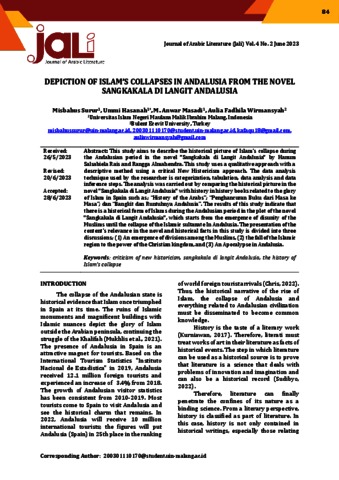 Surur, Misbahus, Hasanah, Ummi, Masadi, M. Anwar and Wirmansyah, Aulia Fadhila (2023) Depiction of Islam’s collapses in Andalusia from the novel Sangkakala di Langit Andalusia. JALi Journal of Arabic Literature, 4 (2). pp. 84-93. ISSN 2722-5585