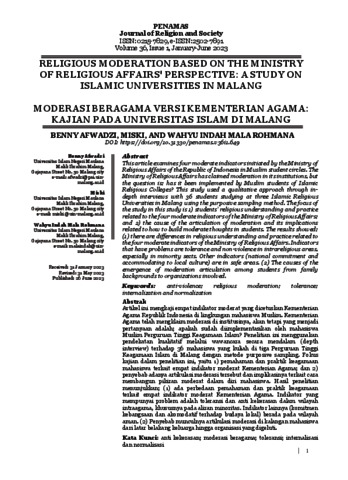 Afwadzi, Benny, Miski, Miski and Rohmana, Wahyu Indah Mala (2023) Religious moderation based on the Ministry of Religious Affairs' perspective: a study on Islamic universities in Malang. Penamas, 36 (1). pp. 1-17. ISSN ISSN : 0215-7829; e-ISSN: 2502-7891