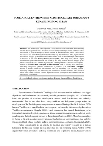 The Tamblingan land conflict is closely related to the investment trend heading towards Bali’s upstream area. Investors are converting Tamblingan forest land into hotels and tourism to reap the benefits of nature tourism in the most natural forest. This issue is discussed in the novel Kunang-Kunang Hitam by Geg Ary Suharsani. This paper aims to describe the struggle of the female character Ni Luh Candri in the Tamblingan land conflict as narrated in the novel Kunang-Kunang Hitam (KKH). This study uses a Susan Griffin perspective ecofeminism approach. The results of this study indicate that the struggle of the female character Ni Luh Candri in defending the Tamblingan forest is divided into two forms: Ni Luh Candri’s struggles related to nature, such as refusing land conversion, protecting rare plants, symbolic communication to fireflies and Ni Luh Candri’s struggles related to nature humanistic environment, such as becoming Leak, burning incense, displaying rangda mask, and advocating for communities around the forest. This research proves that women can take various important actions (ecological environmentalism) to preserve the environment.
