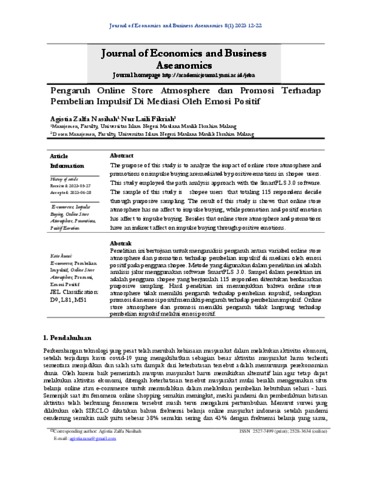 Nasihah, Agistia Zalfa and Fikriah, Nur Laili (2023) Pengaruh Online Store Atmosphere dan Promosi Terhadap Pembelian Impulsif Di Mediasi Oleh Emosi Positif. Pengaruh Online Store Atmosphere dan Promosi Terhadap Pembelian Impulsif Di Mediasi Oleh Emosi Positif, 8 (1). pp. 12-22. ISSN 2527-7499