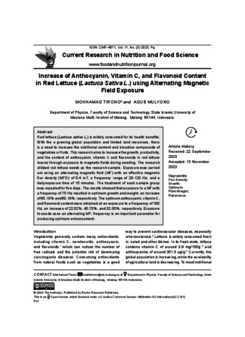 Red lettuce (Lactuca sativa L.) is widely consumed for its health benefits. With the a growing global population and limited land resources, there is a need to increase the nutritional content and bioactive compounds of vegetables or fruits. This research aims to increase the growth, productivity, and the content of anthocyanin, vitamin C and flavonoids in red lettuce leaves through exposure to magnetic fields during seeding. The research utilized red lettuce seeds as the research sample. Exposure was carried out using an alternating magnetic field (MF) with an effective magnetic flux density (MFD) of 0.4 mT, a frequency range of 25-125 Hz, and a dailyexposure time of 15 minutes. The treatment of each sample group was repeated for five days. The results showed that exposure to a MF with a frequency of 75 Hz resulted in optimum growth and weight, an increase of 65.15% and 60.18%, respectively. The optimum anthocyanin, vitamin C, and flavonoid content were obtained at an exposure to a frequency of 100 Hz, an increase of 22.52%, 40.70%, and 32.50%, respectively. Exposure to seeds uses an alternating MF; frequency is an important parameter for producing optimum enhancement.