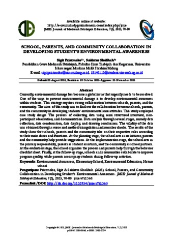 Currently, environmental damage has become a global issue that urgently needs to be resolved. One of the ways to prevent environmental damage is to develop environmental awareness within students. This strategy requires strong collaboration between schools, parents, and the community. The aims of this study was to find out the collaboration between schools, parents, and the community in developing students' environmental care attitudes. This study employed case study design. The process of collecting data using semi structured interview, non- participant observation, and documentation. Data analysis through several stages, namely data collection, data condensation, data display, and drawing conclusions. The validity of the data was obtained through source and method triangulation and member checks. The results of the study show that schools, parents and the community take on their respective roles according to their main duties and functions. At the planning stage, the school acts as an initiator, parents and the community help provide suggestions. At the implementation stage, the school acts as the primary responsibility, parents as student assistants, and the community as school partners. At the evaluation stage, the school organizes the process and parents help through the behavior checklist sheet. Finally, at the follow-up stage, schools and communities collaborate to improve program quality, while parents accompany students during follow-up activities.