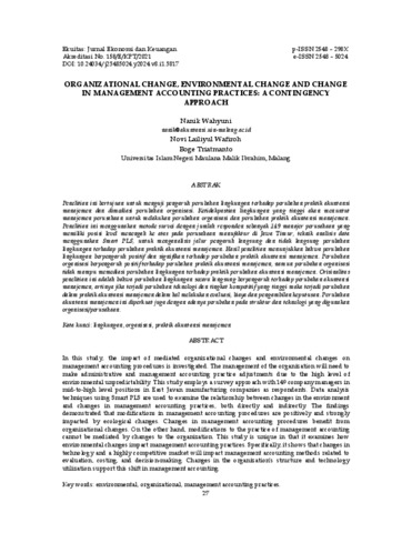 Wahyuni, Nanik, Wafiroh, Novi Lailiyul and Triatmanto, Boge (2024) Organizational change, environmental change and change in management accounting practices: A contingency approach. Ekuitas: Jurnal Ekonomi dan Keuangan, 8 (1). pp. 27-45. ISSN 25485024