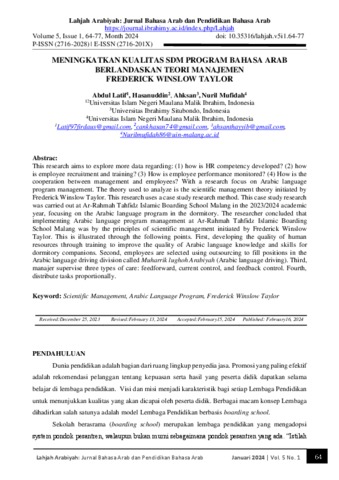 Latif, Abdul, Hasanuddin, Hasanuddin, Akhsan, Akhsan and Mufidah, Nuril (2024) Meningkatkan kualitas SDM Program Bahasa Arab berlandaskan Teori Manajemen Frederick Winslow Taylor. Lahjah Arabiyah: Jurnal Bahasa Arab dan Pendidikan Bahasa Arab, 5 (1). pp. 64-77. ISSN 2716-2028