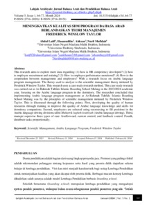 This research aims to explore more data regarding: (1) how is HR competency developed? (2) how is employee recruitment and training? (3) How is employee performance monitored? (4) How is the cooperation between management and employees? With a research focus on Arabic language program management. The theory used to analyze is the scientific management theory initiated by Frederick Winslow Taylor. This research uses a case study research method. This case study research was carried out at Ar-Rahmah Tahfidz Islamic Boarding School Malang in the 2023/2024 academic year, focusing on the Arabic language program in the dormitory. The researcher concluded that implementing Arabic language program management at Ar-Rahmah Tahfidz Islamic Boarding School Malang was by the principles of scientific management initiated by Frederick Winslow Taylor. This is illustrated through the following points. First, developing the quality of human resources through training to improve the quality of Arabic language knowledge and skills for dormitory companions. Second, employees are selected using outsourcing to fill positions in the Arabic language driving division called Muharrik lughoh Arabiyah (Arabic language driving). Third, manajer supervise three types of care: feedforward, current control, and feedback control. Fourth, distribute tasks proportionally