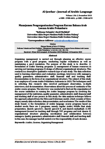 Yolanda, Refiyana and Mufidah, Nuril (2023) Manajamen pengorganisasian Program Kursus Bahasa Arab Leesan Arabic Pekanbaru. Al-Jawhar: Journal of Arabic Language, 1 (2). pp. 105-116. ISSN 2988-6651