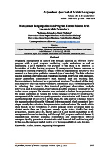 formulation of Arabic learning programs 2) management of human resources in carrying out learning programs 3) design of efficient organizational structures. This research is a descriptive qualitative research type of case study. The data collection used is learning observation and evaluation meetings. Interviews with managers, quality guarantors, administrative staff, financial staff and teaching staff.