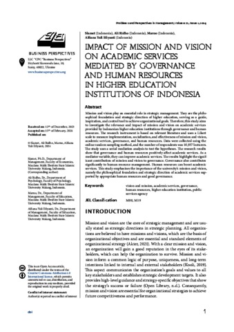 Impact of mission and vision on academic services mediated by governance and human resources in higher education institutions of Indonesia.