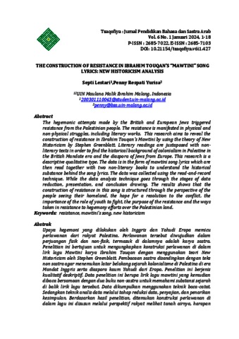 The hegemonic attempts made by the British and European Jews triggered resistance from the Palestinian people. The resistance is manifested in physical and non-physical struggles, including literary works. This research aims to reveal the construction of resistance in Ibrahim Touqan's Mawtini by using the theory of New Historicism by Stephen Greenblatt. Literary readings are juxtaposed with non-literary texts in order to find the historical background of colonialism in Palestine in the British Mandate era and the diaspora of Jews from Europe. This research is a descriptive qualitative type. The data of this research is in the form of mawtini song lyrics which are then read together with two non-literary books to understand the historical substance behind the song lyrics. Based on the results of the research, it was found that the construction of resistance in this song is structured through the perspective of the people seeing their homeland, the hope for a resolution to the conflict, the importance of the role of youth to fight, the purpose of the resistance and the methods taken in resistance to hegemony efforts over the land of Palestine.