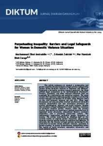 Amiruddin, Mochammad Zikni, Zuhriah, Erfaniah and Zarapi, Nur Hamizah Binti (2024) Perpetuating inequality: Barriers and legal safeguards for women in domestic violence situations. Diktum: Jurnal Syariah dan Hukum, 22 (1). pp. 1-9. ISSN 1693-1777, 2548-8414