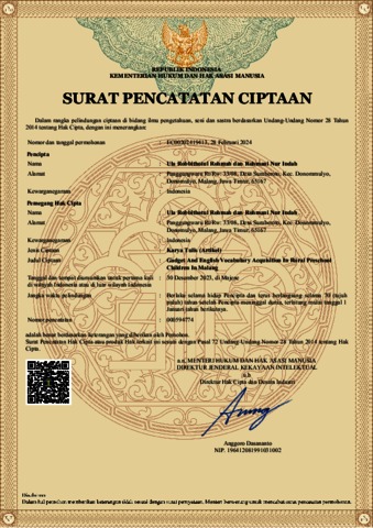 Ula Robbithotul Rohmah, Rohmani Nur Indah (2023) Gadget and English Vocabulary Acquisition in Rural Preschool Children in Malang (sertifikat hak cipta). 000594774.