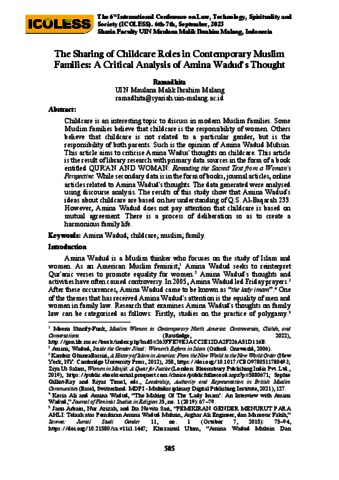 Ramadhita, Ramadhita (2023) The Sharing of Childcare Roles in Contemporary Muslim Families: A Critical Analysis of Amina Wadud's Thought. Presented at ICOLESS-The 6th International Conference on Law, Technology, Spirituality and Society, 6-7 September 2023, Malang.