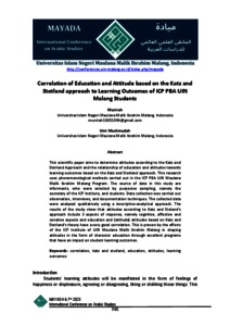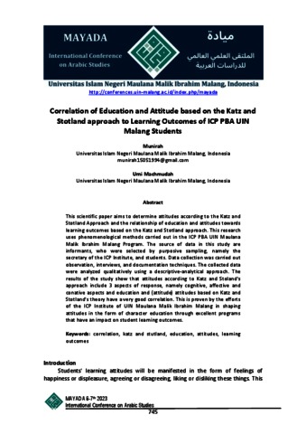 Munirah, Munirah and Umi Machmudah, Umi Machmudah (2023) Correlation of education and attitude based on the Katz and Stotland approach to learning outcomes of ICP PBA UIN Malang Students. Presented at International Conference on Arabic Studies, 2023, UIN Maulana Malik Ibrahim Malang.