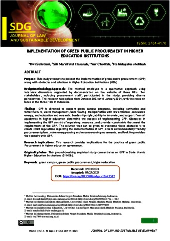 Findings: GPP is directed to support green campus programs, including sanitation and infrastructure, waste management, water saving, transportation with low emissions, renewable energy, and education and research. Leadership style, ability to innovate, and support from all academics in higher education determine the success of implementing GPP. Obstacles in implementing the GPP consist of regulatory, resource, and provider constraints that meet the requirements of the GPP. The solution that can be given to overcome these obstacles is to create strict regulations regarding the Implementation of GPP, create environmentally friendly procurement plans, make energy-saving and resource-saving movements, and look for providers that comply with GPP.