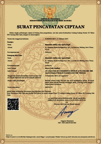 Hamadah Ashfiya, Agwin Degaf (2024) An analysis of commissive speech acts used by the main characters in Women-Centric Movies (sertifikat hak cipta). 000594178.
