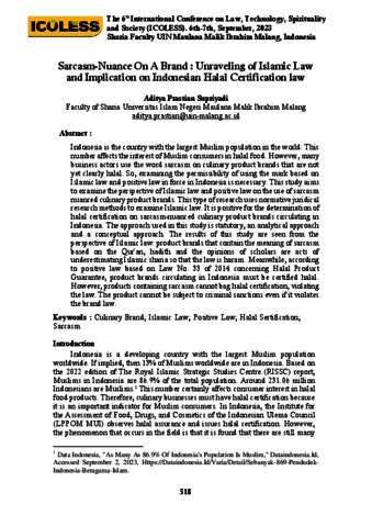 Indonesia is the country with the largest Muslim population in the world. This number affects the interest of Muslim consumers in halal food. However, many business actors use the word sarcasm on culinary product brands that are not yet clearly halal. So, examining the permissibility of using the mark based on Islamic law and positive law in force in Indonesia is necessary. This study aims to examine the perspective of Islamic law and positive law on the use of sarcasm nuanced culinary product brands. This type of research uses normative juridical research methods to examine Islamic law. It is positive for the determination of halal certification on sarcasm-nuanced culinary product brands circulating in Indonesia. The approach used in this study is statutory, an analytical approach and a conceptual approach. The results of this study are seen from the perspective of Islamic law: product brands that contain the meaning of sarcasm based on the Qur'an, hadith and the opinions of scholars are acts of underestimating Islamic sharia so that the law is haram. Meanwhile, according to positive law based on Law No. 33 of 2014 concerning Halal Product Guarantee, product brands circulating in Indonesia must be certified halal. However, products containing sarcasm cannot bag halal certification, violating the law. The product cannot be subject to criminal sanctions even if it violates the brand law.
