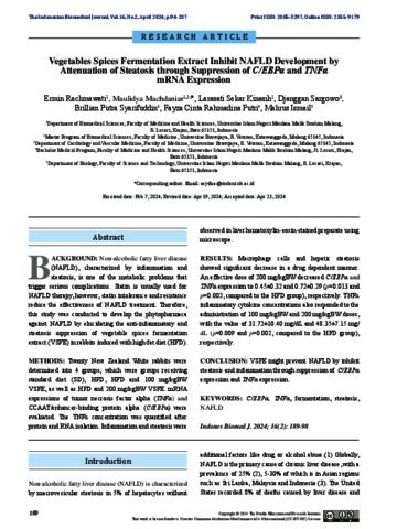 BACKGROUND: Non-alcoholic fatty liver disease (NAFLD), characterized by inflammation and steatosis, is one of the metabolic problems that trigger serious complications. Statin is usually used for NAFLD therapy, however, statin intolerance and resistance reduce the effectiveness of NAFLD treatment. Therefore, this study was conducted to develop the phytopharmaca against NAFLD by elucidating the anti-inflammatory and steatosis suppression of vegetable spices fermentation extract (VSFE) in rabbits induced with high-fat diet (HFD).