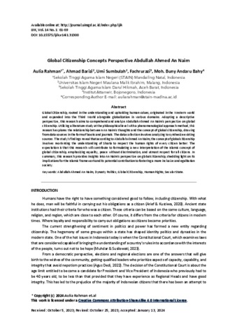 Rahman, Aulia, Barizi, Ahmad, Sumbulah, Umi, Fachrurazi, Fachrurazi and Bahy, Moh. Buny Andaru (2024) Global citizenship concepts perspective Abdullah Ahmed An Naim. IJIK: International Journal of Islamic Khazanah, 14 (1). pp. 61-69. ISSN 2302-9366; 2302-9781