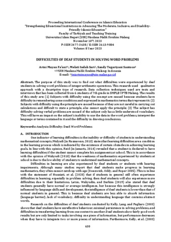 The purpose of this study was to find out what difficulties were experienced by deaf students in solving word problems of integer arithmetic operations. This research used qualitative approach with a descriptive type of research. Data collection techniques used are tests and interviews that has been collected from 6 students of 7th grade in SMPLB YPTB Malang. The results of this study are; (1) Subjects with difficulty using the concept are caused because students have difficulty in remembering some conditions and expressed in mathematics terms that represent it; (2) Subjects with difficulty using the principle are caused because of they are not careful in carrying out calculations and difficult to state a principle, also cannot apply the principle; (3) The subject has difficulty solving verbal problems are caused of the subject only has a little understood vocabulary. This will have an impact on the subject's inability to use the data in the word problems, interpret the language or terms contained in it and the difficulty in drawing conclusions