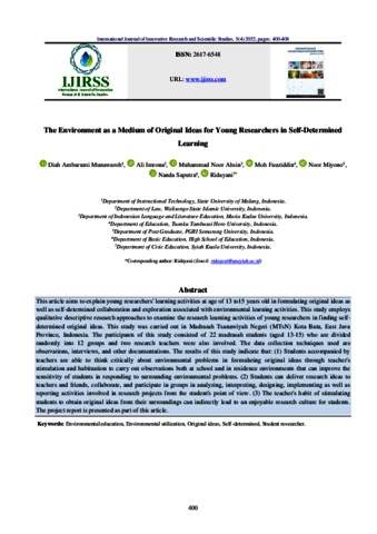 This article aims to explain young researchers' learning activities at age of 13 to15 years old in formulating original ideas as well as self-determined collaboration and exploration associated with environmental learning activities. This study employs qualitative descriptive research approaches to examine the research learning activities of young researchers in finding self- determined original ideas. This study was carried out in Madrasah Tsanawiyah Negeri (MTsN) Kota Batu, East Java Province, Indonesia. The participants of this study consisted of 22 madrasah students (aged 13-15) who are divided randomly into 12 groups and two research teachers were also involved. The data collection techniques used are observations, interviews, and other documentations. The results of this study indicate that: (1) Students accompanied by teachers are able to think critically about environmental problems in formulating original ideas through teacher's stimulation and habituation to carry out observations both at school and in residence environments that can improve the sensitivity of students in responding to surrounding environmental problems. (2) Students can deliver research ideas to teachers and friends, collaborate, and participate in groups in analyzing, interpreting, designing, implementing as well as reporting activities involved in research projects from the student's point of view. (3) The teacher's habit of stimulating students to obtain original ideas from their surroundings can indirectly lead to an enjoyable research culture for students. The project report is presented as part of this article.