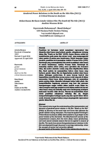 This research aimsto get the understanding of the representation and dynamics of gendered power relation in the film "Death on the Nile" (2022), by focusing on the social roles and norms that influence the gender relation among characters. The research applied Fairclough’s Critical Discourse Analysis (CDA) which enabled us to go deeper on the power relation of the characters. The CDA framework consists of the comprehensive analysis, from the micro (text), mezzo (production),and macro (social context) analysis that can be applied in analysis of the film. The results have proven that gendered power relations in this film were depicted through the power in marriage relationship, where the concepts of control and ownership reflected the social norms of the society. Power in love relationship also play an important role in relationship dynamics, highlighting how strong feelings and dependency can influence the social practice. In addition, power in parent-children relationship can continue even after children become adults. These findings provided a foundation for further research on the representation of gender-based power relations in film, taking into account the other aspects such as the social, economic, and cultural factors that influenced gender representation.
