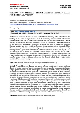 Mutammimah, Bidayatul and Suwandi, Suwandi (2023) Tinjauan ‘urf terhadap tradisi Meuleum Harupat dalam pernikahan adat Sunda. Al-Syakhsiyyah: Journal of Law & Family Studies, 5 (2). ISSN 27156699