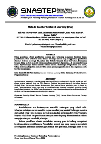 Dalam pemilihan sebuah pendekatan seorang guru terkadang mengalami kesulitan dalam pemilihannya. Pada artikel ini akan dibahas beberapa metode yang menggunakan pendekatan (Teacher Centered Learning) TCL antara lain: Metode Ceramah, Direct Instruction, Pencapaian Konsep. Setiap metode memiliki kekhususan kapan sebaiknya digunakan. Ada beberapa hal yang harus dipertimbangan ketika memilih sebuah metode, diantaranya: Pengetahuan awal siswa, bidang studi yang diajarkan, alokasi waktu, sarana penunjang, jumlah siswa dan pengalaman serta kewibawaan pengajar.