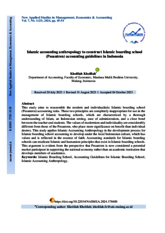 This study aims to reassemble the modern and individualistic Islamic boarding school (Pesantren) accounting rules. These two principles are completely inappropriate for use in the management of Islamic boarding schools, which are characterized by a thorough understanding of Islam, an Indonesian setting, ease of administration, and a close bond between the teacher and students. The values of modernism and individuality are considerably different from those of the Pesantren, who place more significance on benefit than individual desires. This study applies Islamic Accounting Anthropology in the development process for Islamic boarding school accounting to develop under the local Indonesian culture, which has values and is reflected in the essence of faith. Accounting standards for Islamic boarding schools can eradicate Islamic and humanism principles that exist in Islamic boarding schools. This argument is evident from the perspective that Pesantren is now considered a potential market participant in supporting the national economy rather than an academic institution that develops members of academics.