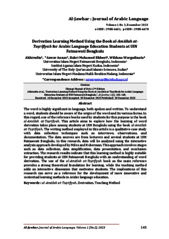 The word is highly significant in language, both spoken and written. To understand a word, students should be aware of the origin of the word and its various forms. In this regard, one of the reference books used by students for this purpose is the book al-Amṡilah at-Taṣrifiyah. This article aims to explore how the learning of word derivation takes place among students at UIN Bengkulu using the book al-Amṡilah at-Taṣrifiyah. The writing method employed in this article is a qualitative case study with data collection techniques such as interviews, observations, and documentation. The data sources are from lecturers and several students at UIN Fatmawati Bengkulu. In this research, data will be analyzed using the interactive analysis approach developed by Miles and Huberman. This approach involves stages such as data collection, data simplification, data presentation, and conclusion extraction. The research results indicate that this learning method is highly suitable for providing students at UIN Fatmawati Bengkulu with an understanding of word derivation. The use of the al-Amṡilah at-Taṣrifiyah book as the main reference provides a strong theoretical foundation for learning, while the teaching method adds an interactive dimension that motivates students. The implications of this research can serve as a reference for the development of more innovative and contextual learning methods in Arabic language education.