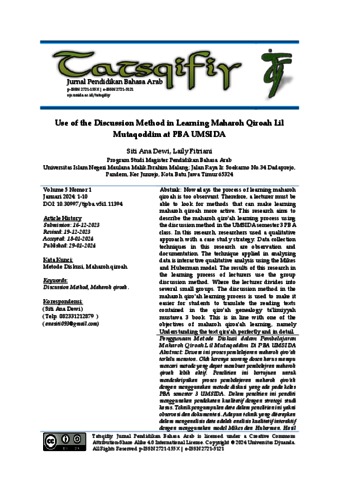 Dewi, Siti Ana and Fitriani, Laily (2024) Use of the discussion method in learning maharoh qiroah lil mutaqoddim at PBA UMSIDA. Tatsqify: Jurnal Pendidikan Bahasa Arab, 5 (1). pp. 1-10. ISSN 2721155X (p.); 27215121 (e.)