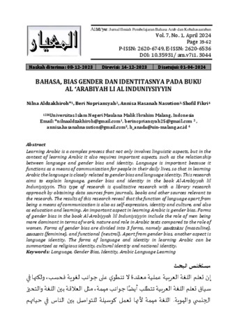 Learning Arabic is a complex process that not only involves linguistic aspects, but in the context of learning Arabic, it also requires important aspects, such as the relationship between language, gender bias, and identity. Language is important because it functions as a means of communication for people in their daily lives, so learning Arabic is closely related to gender bias and language identity. This research aims to explain language, gender bias, and identity in the book Al-Arobiyyah lil Induniysiyyin. This type of research is qualitative and uses a library research approach by obtaining data from journals, books, and other sources relevant to the research. The results of this research reveal that the function of language, apart from being a means of communication, also includes self-expression, identity, and culture, as well as education and learning. An important aspect of learning Arabic is gender bias. Forms of gender bias in the book Al-Arobiyyah lil Induniysiyyin include the role of men being more dominant in terms of work, nature, and role in Arabic texts compared to the role of women. Forms of gender bias are divided into three categories: mudzakar (masculine), muanats (feminine), and functional (neutral). Apart from gender bias, another aspect is language identity. The forms of language and identity learned in Arabic can be summarized as religious identity, cultural identity, and national identity.