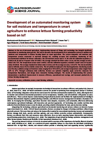 Development of an automated monitoring system for soil moisture and temperature in smart agriculture to enhance lettuce farming productivity based on IoT.