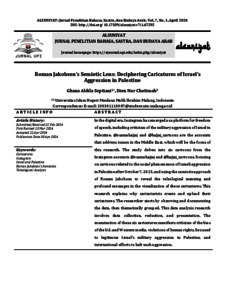 Septiani, Ghana Aldila and Chotimah, Dien Nur (2024) Roman Jakobson's semiotic lens: Deciphering caricatures of Israel's aggression in Palestine. Alsuniyat: Jurnal Penelitian Bahasa, Sastra, dan Budaya Arab, 7 (1). pp. 77-101. ISSN 2721480X