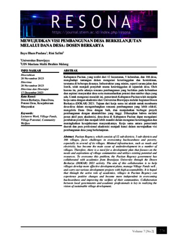 Pradana, Bayu Ilham and Safitri, Rini (2023) Mewujudkan visi pembangunan desa berkelanjutan melalui dana desa: Dosen berkarya. Resona: Jurnal Ilmiah Pengabdian Masyarakat, 7 (2). ISSN 26142481