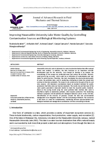 Improving Hasanuddin University Lake water quality by controlling contamination sources and biological monitoring systems.