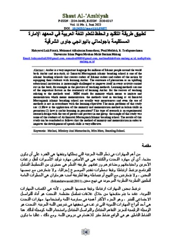 Tathbiq Thariqah al Taqlid wa al Hifdz li Ta’alum al Lughah al Arabiyyah fi al Ma’had al Imarah al Mustaqimah Bajol Mati Banyuwangi Jawa al Syarqiyah.