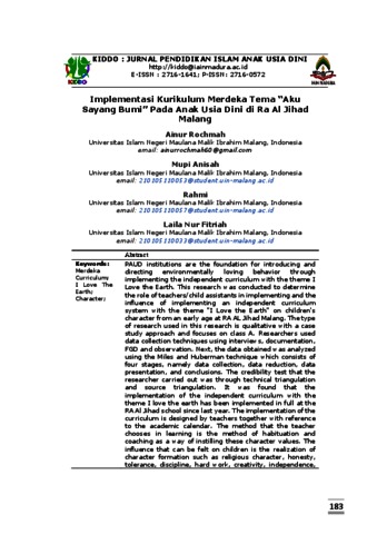 Rochmah, Ainur, Anisah, Mupi, Rahmi, Rahmi and Fitriah, Laila Nur (2024) Implementasi Kurikulum Merdeka tema “Aku Sayang Bumi” pada anak usia dini di RA Al Jihad Malang. Kiddo: Jurnal Pendidikan Islam Anak Usia Dini, 5 (1). ISSN 27161641