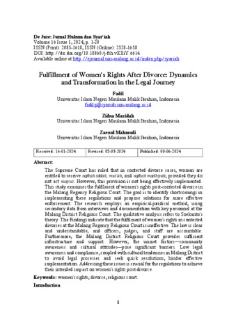 Fadil, Fadil, Mazidah, Zidna and Mahmudi, Zaenul (2024) Fulfillment of women's rights after divorce: Dynamics and transformation in the legal journey. De Jure: Jurnal Hukum dan Syar'iah, 16 (1). pp. 1-20. ISSN 2528-1658 (In Press)
