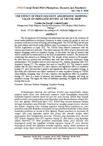Farida, Lailatul and Rasyid, Cynthia Nur (2023) The effect of price discount and hedonic shopping value on impulsive buying at Tiktok Shop. Jurnal Ilmiah Manajemen Ekonomi dan Akuntansi (MEA), 7 (3). pp. 245-257. ISSN 2541-5255