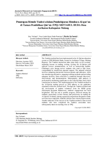 Yulianti, Eny, Praminto, Yusa Linda Qotru Nada, Sya’baniah, Khalda, Rohmad, c and Chilmy, Mochammad Sholla Nadhif (2024) Penerapan metode Yanbu’a dalam pembelajaran membaca Al-Qur’an di Taman Pendidikan Qur’an (TPQ) Miftahul Huda Desa Asrikaton Kabupaten Malang. Journal of Research on Community Engagement (JRCE), 5 (2). pp. 66-72. ISSN 2614-1477 and e-ISSN 2597-629X