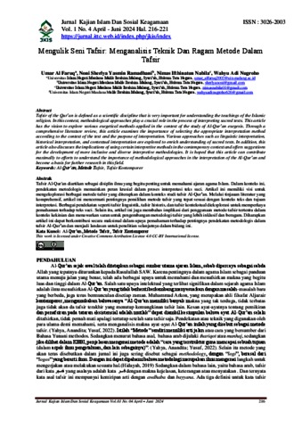 Tafsir Al-Qur'an diartikan sebagai disiplin ilmu yang begitu penting untuk memahami ajaran agama Islam. Dalam konteks ini, pendekatan metodologis memainkan peran krusial dalam proses interpretasi teks suci. Artikel ini memiliki visi untuk mengeksplorasi berbagai metode tafsir yang diterapkan dalam konteks studi tafsir Al-Qur’an. Melalui tinjauan literatur yang komprehensif, artikel ini mencermati pentingnya pemilihan metode tafsir yang tepat sesuai dengan konteks teks dan tujuan interpretasi. Berbagai pendekatan seperti tafsir linguistik, tafsir historis, dan tafsir kontekstual dieksplorasi untuk memperkaya pemahaman terhadap teks suci. Selain itu, artikel ini juga membahas implikasi dari penggunaan metode tafsir tertentu dalam konteks kekinian dan menawarkan saran untuk pengembangan metodologi tafsir yang lebih inklusif dan beragam. Diharapkan artikel ini dapat berkontribusi secara maksimal dalam upaya pemahaman terhadap pentingnya pendekatan metodologis dalam tafsir Al-Qur’an dan menjadi landasan untuk penelitian selanjutnya dalam bidang ini.
