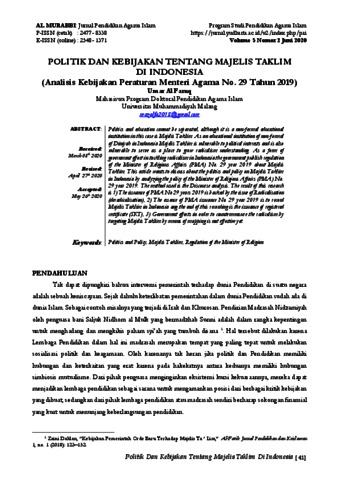 | Keywords: | politics and policy; majelis taklim; regulation of the minister of religion |