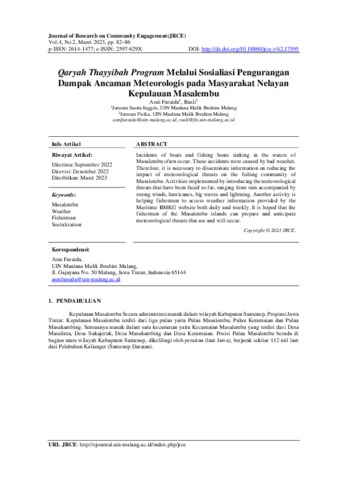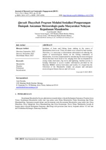 Furaida, Asni and Rusli, Rusli (2023) Qaryah Thayyibah program melalui sosialiasi pengurangan dampak ancaman Meteorologis pada masyarakat nelayan Kepulauan Masalembu. Journal of Research on Community Engagement, 4 (2). pp. 82-86. ISSN 2614-1477 ; E-ISSN : 2597-629X