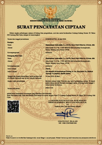 Amiruddin, Muhammad and Oktavia, Reza Putri and Hidayat, Hakmi (2024) The benefits of intermittent Fasting as an alternative to medical therapy to improve health status (sertifikat hak cipta). 000623138.