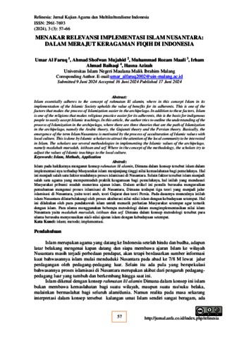 Islam pada hakikatnya menganut konsep rahmatan lil alamin, Dimana dalam konsep tersebut islam dalam implementasi nya terhadap Masyarakat islam menjunjung tinggi nilai kemaslahatan bagi pemeluknya. Hal ini menjadi salah satu faktor mudahnya proses islamisasi di Nusantara. Selain faktor tersebut islam menjadi salah satu agama yang mempermudah praktik keagamaan bagi pemeluknya, hal inilah yang mendasari Masyarakat pribumi mudah menerima ajaran islam. Dalam artikel ini penulis berusaha menguraikan pemahaman mengenai proses islamisasi di Nusantara, Dimana terdapat tiga teori yang menjadi jalur islamisasi di Nusantara, yaitu teori arab, teori Gujarat dan teori Persia. Pada dasarnya munculnya istilah islam Nusantara dilatarbelakangi oleh proses akulturasi nilai-nilai islam dengan kebudayaan setempat. Hal ini dilakukan oleh para pendakawah islam untuk menarik perhatian Masyarakat setempat agar tertarik dengan islam. Para ulama menggunakan beberapa metodologi dalam mengimplementasikan nilai islam Nusantara yaitu maslahah mursalah, istihsan dan urf. Dimana dalam konsep metodologi tersebut para ulama berusaha menyesuaikan niali-nilai ajaran islam dengan kebudayaan setempat.