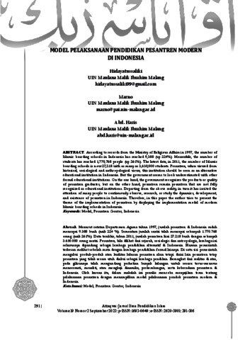 According to records from the Ministry of Religious Affairs in 1997, the number of Islamic boarding schools in Indonesia has reached 9,388 (up 224%). Meanwhile, the number of students has reached 1,770,768 people (up 261%). The latest data, in 2011, the number of Islamic boarding schools is now 27,218 with as many as 3,650,000 students. Pesantren, when viewed from historical, sociological and anthropological views, this institution should be seen as an alternative educational institution in Indonesia. But the government seems to look underestimated with other formal educational institutions. On the one hand, the government recognizes the products or quality of pesantren graduates, but on the other hand, pesantren remain pesantren that are not fully recognized as educational institutions. Departing from the above reality, in turn it has invited the attention of many people to continuously observe, research, or study the dynamics, development, and existence of pesantren in Indonesia. Therefore, in this paper the author tries to present the theme of the implementation of pesantren by displaying the implementation model of modern Islamic boarding schools in Indonesia